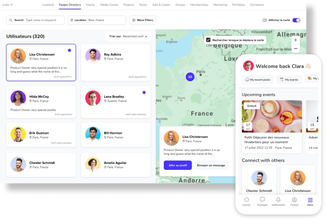Facilitate community connections through custom groupings, searchable profiles, and frictionless messaging.